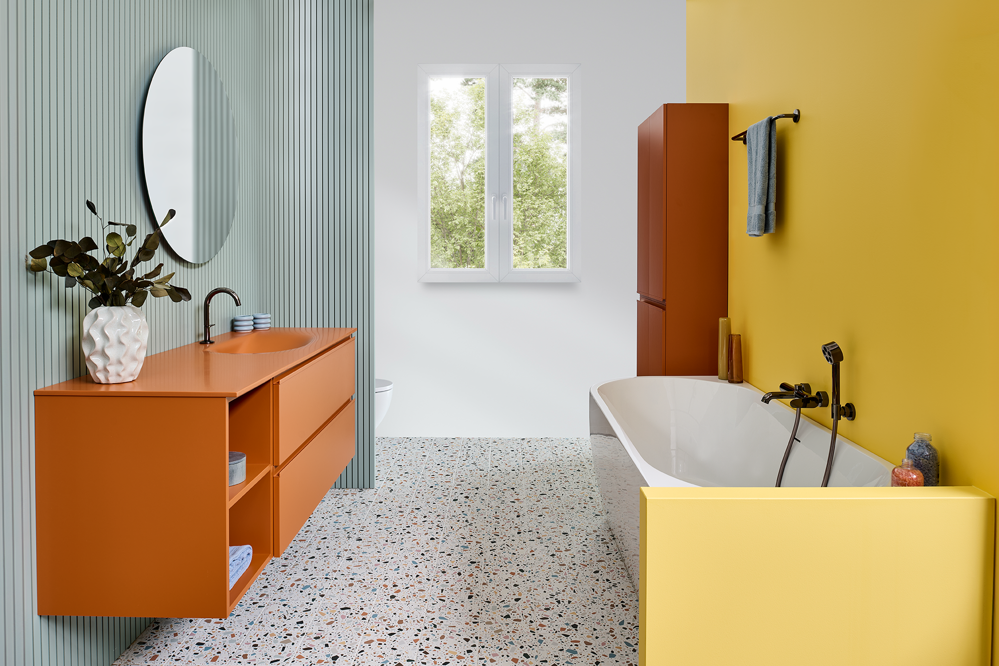 - Accentuez votre salle de bain avec des lavabos, meubles ou toilettes colorés.