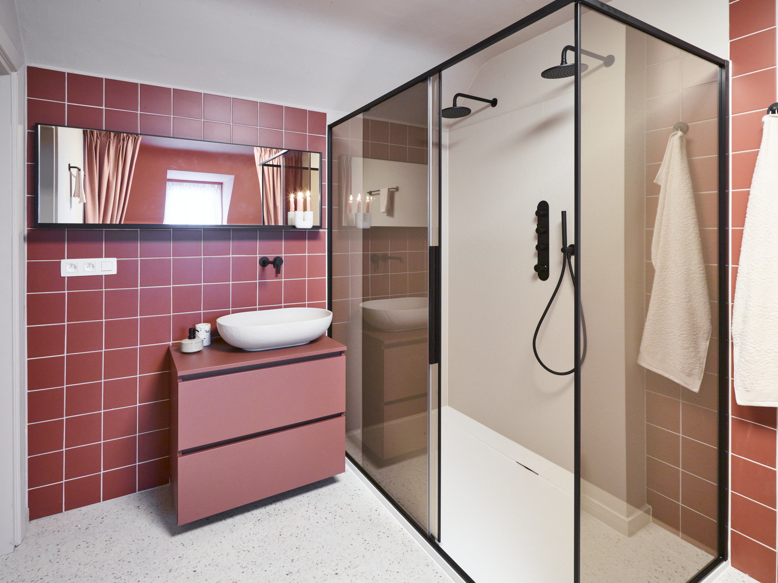- Si vous carreliez les murs de votre salle de bain, optez pour des carreaux en mosaïque, des motifs en chevron ou des carreaux en terrazzo pour créer un effet dynamique. Vous préférez quelque chose de plus subtil ? Choisissez des joints colorés entre des carreaux neutres. Une belle alternative sont les panneaux muraux. Là encore, il existe de nombreuses finitions avec lesquelles vous pouvez aménager votre salle de bain colorée.