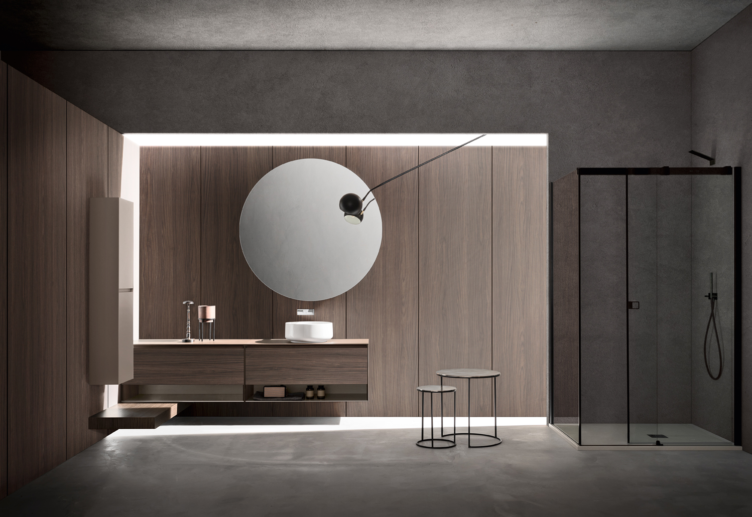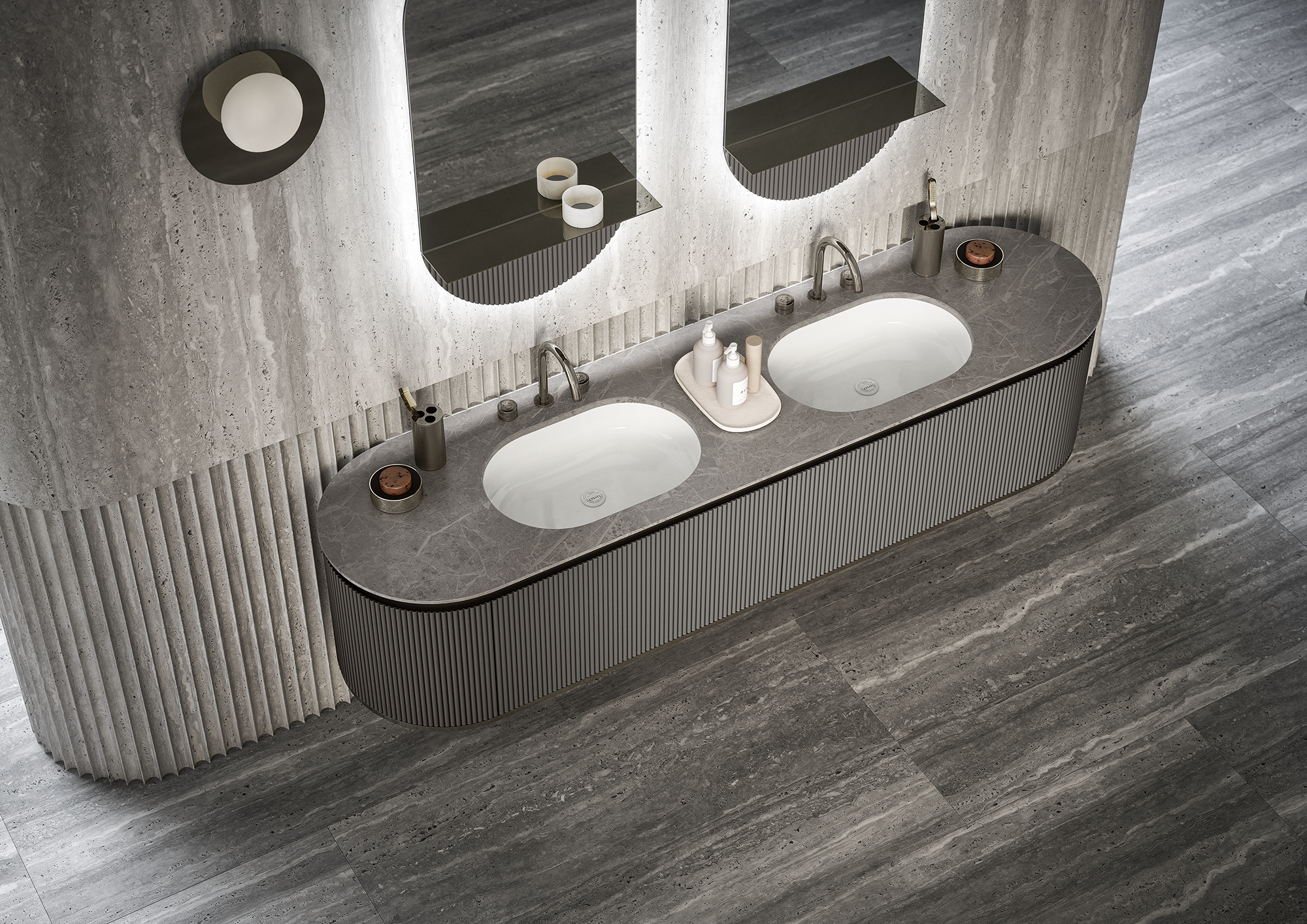 L’éclairage LED dimmable, les spots encastrés et l’éclairage indirect derrière les miroirs ou les meubles créent une ambiance élégante et raffinée.